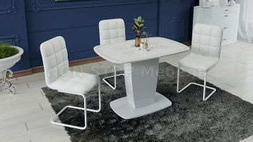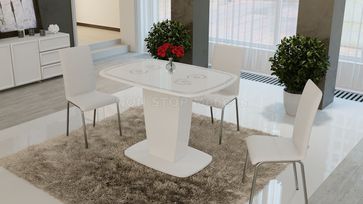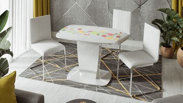 Стол раздвижной Аризона Тип 2 КМ+02.85.000.002 Цвет Белый глянец с рисунком Фрукты, Белый глянец с рисунком золото, Белый глянец с рисунком серебро Размеры (Д×Ш×В): 1100(1420)×770×750 Механизм раздвижения синхронный Можно дополнить стульями как на изображении (Марсель, Франко, София), так и другими моделями None