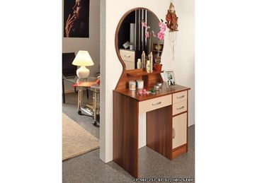 Стол туалетный "Надежда- М04" Габарит: 1650 х 804 х 390 Цветовая комбинация: Венге / Дуб линдберг (Дуб молочный), ясень шимо / дуб линдберг (дуб молочный) Стол с фигурным зеркалом и открытой полкой, под столешницей - три выдвижных ящика (один большой слева и два поменьше один под другим- справа). Секция с полкой за распашной дверью под ящиками. Модель установлена на цоколь None