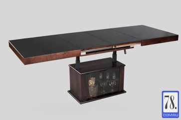 Стол оборудован подъёмными механизмами компании Ilse, которые сделаны в Германии из стали специального сплава и не требуют какого-либо специального обслуживания, благодаря высокому качеству. Для продления столешницы мы используем направляющие компании «POETKER». Механизм регулировки высоты — пневматический, бесступенчатый (можно фиксировать на любой высоте от 56,5 до 75,5 см. Столешница может быть выполнена с белым (304 SB) или чёрным (304 SJ) стеклом, а также может быть и без стекла — в шпоне. В тумбе-основании есть встроенный бар (с августа 2020 г. его двери могут быть выполнены только из прозрачного стекла). Столы Optimata в нашем салоне: