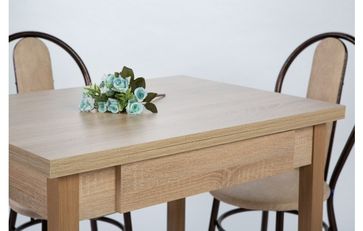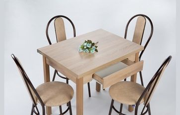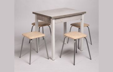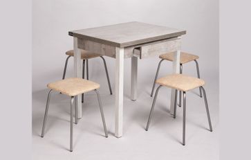 обеденная группа с ящиком финдус состоит из стола раскладного в сложенном виде 6080,в разложенном 60120см.Стол оснащён выдвижным ящиком.Ножки деревянные квадрат.В комплекте 4 квадратных табурета на металлокаркасе,сидение (наполнение поролон,обивка экокожа). None Страна производства: Россия Есть доставка.