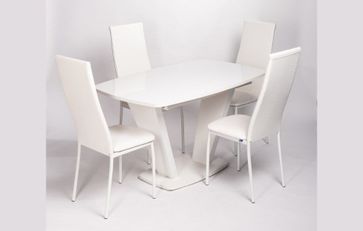 обеденная группа Вегас/пекин состоит из стола Столешница — пластик Белый глянец .Царговый пояс-металлический,окрашенный порошковой эмалью.механизм раздвижения столешницы синхронный с замками фиксаторами от Итальянского производителя.V — образная опора толщиной 60мм.Габаритная длина 1300 мм. Габаритная длина (в разложенном виде) 1700 мм. Габаритная ширина 800 мм. Габаритная высота 750 мм.+4 Стула ,на металлическом каркасе,обивка высококачественная экокожа .Стулья с высокой спинкой,что придаёт удобства спине при сидении. None Есть доставка.