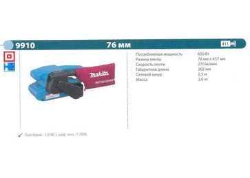 - Шлифмашина ленточная MAKITA 9910 (650Вт, 76х457мм, 270м мин, 2.6кг) по выгодной цене 4 050 р. руб.;