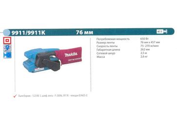 - Шлифмашина ленточная MAKITA 9911 (650Вт, 76х457мм, 75-270м мин, 2.6кг) в каталоге Шлифовальное оборудование в Санкт-Петербурге;
