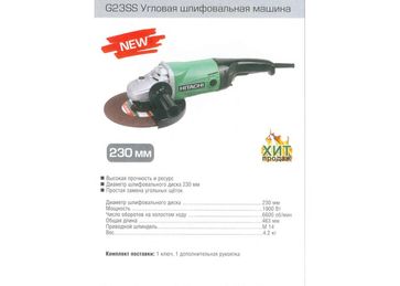 - Шлифмашина угловая HITACHI G23SS (1900Вт, 230мм, 4.2кг) по выгодной цене 2 950 р. руб.;