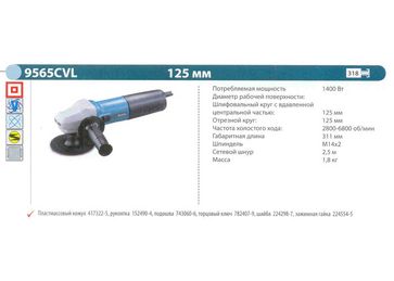 - Шлифмашина угловая Makita 9565CVL (1400Вт, 125мм, 2800-6800об мин, 1.8кг) по выгодной цене 6 050 р. руб.;