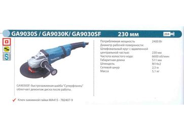 - Шлифмашина угловая MAKITA GA 9030 SF 01 (2400Вт, 230мм, 6600об мин, 5.1кг, пл.пуск, кейс) по выгодной цене 6 300 р. руб.;