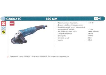 - Шлифмашина угловая MAKITA GA6021C (1450Вт, 150мм, 10000об мин, 2.5 кг) по выгодной цене 5 200 р. руб.;