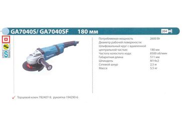 - Шлифмашина угловая MAKITA GA7040SF01 (2600Вт, 180мм, 8500об мин, 5.5 кг, пл. пуск) в каталоге Шлифовальное оборудование в Санкт-Петербурге;