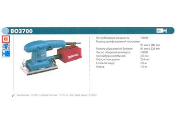 - Шлифмашина вибрационная MAKITA BO3700 (180Вт, 93х185 228мм, 10000об мин, 1.4кг) по выгодной цене 2 250 р. руб.;