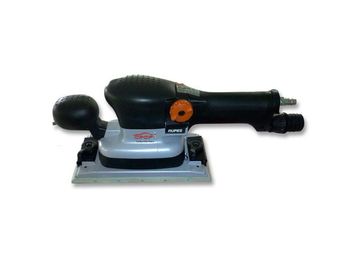 Орбитальная шлифовальная минимашинка с пылеотводом и прямоугольной подошвой (115х208 мм, липучка и зажимы для абразивной бумаги в комплекте), регулятор оборотов, пылезащитная диафрагма двигателя и подшипников, частота вращения 3500-9500 об/мин, давление 6 бар, орбитальный ход 3 мм, вес 2,4 кг