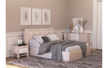Коллекция мебели Лаура - залог уюта и комфорта Вашей спальни. Текстура ясень анкор с эффектом натурального дерева прекрасно сочетается с декоративными вставками цвета софт латте и перламутр. Эксклюзивная лицевая фурнитура разработана специально для данной коллекции. Надежные комплектующие гарантируют долгий срок службы мебели. Комплект состоит из комфортабельной двуспальной кровати шириной 160 см с подъемным механизмом, прикроватной тумбы на ножках с ящиком и открытой полкой, вместительного комода.