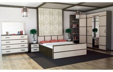 Модульная спальня Сакура — мебель в оригинальном японском стиле с характерным делением фасадов на правильные геометрические области, разграниченные вставками контрастного цвета. В модульной серии представлены шкафы (в том числе и шкафы-купе), кровати с ящиками, прикроватные тумбы и комод. Мебель изготовлена из ЛДСП с отделкой фасадов профилем МДФ. В композицию, как на фото, включены: