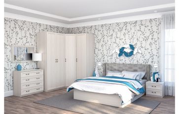 Комод с четырьмя ящиками; Шкаф 2 створчатый. Внутреннее наполнение: левая секция со штангой для одежды и полкой, правая - с четырьмя вместительными полками; Шкаф угловой. Внутреннее наполнение: отделение с пятью полками для белья, антресольная полка и металлическая штанга для одежды; Пенал с четырьмя полками; Две тумбы прикроватных с двумя выдвижными ящиками; Кровать с мягким изголовьем "Модерн" (спальное место 1600х2000), настил ЛДСП; Зеркало.