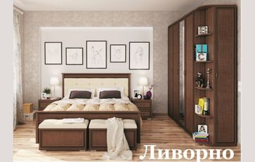 Спальня Ливорно — это классическое решение в современных формах и реалиях. Теплый оттенок дерева создает уют, а большое количество мест для хранения позволит каждой вещи найти свое место. Материал фасада: Рамочный профиль из МДФ, 3D-вставка из МДФ. Материал корпуса: ЛДСП. На двери шкафов установлены петли с доводчиками для бесшумного закрывания, а на выдвижные ящики — шариковые направляющие полного выдвижения. Фурнитура: в цвете Старая бронза 96 мм. В серии предлагаются шкафы различной дверности и кровати с мягким изголовьем из экокожи двух вариантов ширины спального места с основаниями настил ДСП, ортопедическим на ножках и ортопедическим с подъемным механизмом. В составе композиции: •кровать Ливорно 160 с ортопедическим основанием на ножках (1742х2086х1046); •тумба прикроватная (450х382х456) — 2 шт.; •банкетка (720х334х406) — 2 шт.; •шкаф трехдверный (1350х544х2212); •пенал с полками (450х544х2212); •шкаф торцевой (350х544х2212). Матрас приобретается дополнительно. None Есть доставка.