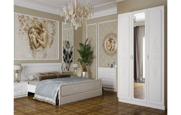 Спальня Магнолия — вызывает восхищение элегантной роскошью. Белая мебель смотрится дорого и стильно. При этом она отлично сочетается с элементами интерьера и отделкой разных цветов. Вместе с белоснежными шкафами, тумбочками и кроватями в комнате появляется ощущение чистоты и свежести. Изюминка дизайна — незатейливые орнаменты на фасадах. В составе комплекта: