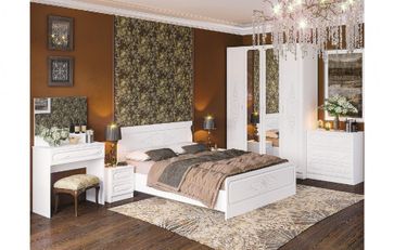 кровать Магнолия 160 (1642х2032х950); тумба прикроватная (410х460х466) — 2 шт.; комод (810х444х816); шкаф 4-х створчатый (1600х540х2216); туалетный стол (810х444х816); зеркало (750х612).