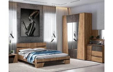 Модульная спальня Соренто — комплект мебели в скандинавском стиле, выполненный в теплом декоре Дуб Крафт в сочетании с Темным бетоном. Материал — ЛДСП. В составе комплекта: •кровать (1674х2074х800) сп.место 160х200, ортопедическое основание; •тумбы прикроватные, 2шт. комплект (502х370х346); •комод (1002х418х75); •зеркало; •шкаф 4-х створчатый (1800х546х2235) 2 штанги, 8 полок. Матрас для кровати приобретается дополнительно. None Страна производства: Россия Есть доставка.