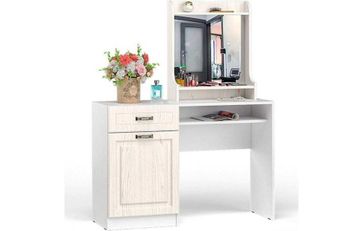 Универсальный мебельный набор из туалетного стола и зеркала подойдет для спальни. Состав комплекта: Комод Полка 10.118 (с зеркалом) Стол туалетный 12.46 Модули изготовлены из ЛДСП 16 мм, фасады выполнены из МДФ 16 мм, с кромкой из ПВХ 0,4 мм. Распашные дверки установлены на четырехшарнирные петли, выдвижные ящики на шариковые направляющие. Ручки - металл в цвете "Старая бронза". Применяется зеркальное полотно толщиной 4 мм, с фацетом 10 мм. None Есть доставка.