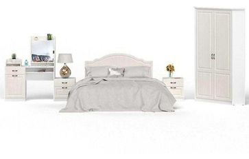 Набор для спальни выполненный в колониальным стиле и светлой цветовой гамме добавит свет в спальню. Гарнитур включает в себя все необходимые модули для комфортного сна и надежной системы хранения вещей. Кровать оснащена ортопедическим основанием без подъемного механизма. Рекомендованная высота матраса от 180 мм. Обратите внимание, матрас в набор не входит. Модуль изготовлена из ЛДСП 16 мм, фасады выполнены из МДФ 16 мм, с кромкой из ПВХ 0,4 мм. Распашные дверки установлены на четырехшарнирные петли, выдвижные ящики на шариковые направляющие. Ручки - металл в цвете "Старая бронза". Применяется зеркальное полотно толщиной 4 мм, с фацетом 10 мм. Состав комплекта: Кровать 11.08 Тумба прикроватная 08.146 (2 шт.) Полка 10.117 Полка 10.118 (с зеркалом) Стол туалетный 12.46 Шкаф для одежды 13.124 None Есть доставка.