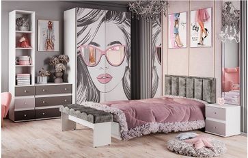 Коллекция мебели Мемори - идеальный вариант обустройства спальной комнаты для девочки. Сочетание спокойных пастельных тонов (серого, бежевого, розового) с белым делают мебель комфортной для восприятия. Кроме того, нейтральные оттенки позволят разместить данный комплект в любом по стилю интерьере. Разнообразие модулей из коллекции Мемори подарит Вам возможность максимально функционально и практично организовать хранение вещей Вашего ребенка. В высоких шкафах найдется место для верхней и деликатной одежды, широкий комод вместит в себя белье и детские игрушки. На полках стеллажа Вы сможете разместить предметы декора и книги. Кровать с прикроватной тумбой и пуфом обеспечат много часов сна спокойного отдыха и сна. Туалетный стол с подсветкой станет любимым уголком Вашей принцессы. Ярким акцентом спальни выступит шкаф с фотопечатью и зеркальными вставками, который не оставит равнодушным ни одну настоящую девочку! None Страна производства: Россия Есть доставка.