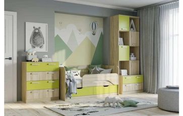 Набор оборудован замечательной кроваткой с бортиками и ящиками для постельного белья. В комплекте комбинированный стеллаж и комод.
