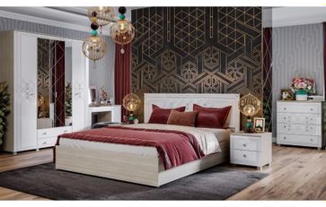 Кровать Амели 160*200, со щитком МДФ в изголовье с ортопедическим основанием АМЕЛИ ТМ-009 (Тумба) Д450 (2 шт.) АМЕЛИ ШК-007 (Шкаф) 4-х ств. Д1700 АМЕЛИ СТ-011 (Стол) туалетный Д1000 АМЕЛИ КМ-008 (Комод) Д800.