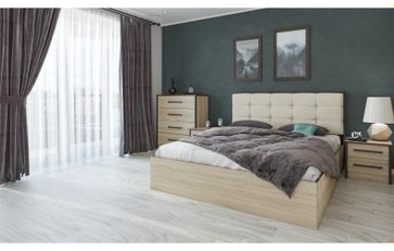 комод (820х440х810); тумба прикроватная (420х375х464) — 2 шт.; кровать ЛК-2 160 + мягкое изголовье велюр Карамель + настил ДВП (1712х2032х1014).
