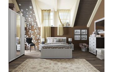 кровать Прага КР-904М 160 + ортопедическое основание на ножках (1650х2032х950); тумба прикроватная ТБ-900 (410х386х440) — 2 шт.; комод КМ-901 с 5-ю ящиками (810х450х986); шкаф 3-х створчатый ШК-903 с зеркалом (1350х510х2065).