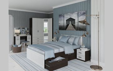 Модульная спальня Прага — выполнена в контрастных цветах — венге премиум и белое дерево. Корпуса модулей изготовлены из ламинированной ДСП, а фасады из МДФ. Модульная серия Прага включает кровати с бельевыми ящиками и без, комоды с 4 и 5 ящиками и большой ассортимент шкафов, что позволяет создавать композиции для помещений различной площади и конфигурации. Кровати укомплектованы основанием: планки + ДВП. В комплект входят: