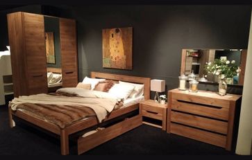 Спальня Афина — мебель для ценителей природы. Гарнитур изготовлен из ЛДСП в древесном декоре дуб крафт табачный галифакс. Естественную красоту дерева подчеркивают вставки в шоколадном декоре Венге на царгах кровати и фасадах модулей, выполненные из ЛДСП. Угловые вставки на модулях и ножках кровати изготовлены из МДФ с пленкой. Ящики комода и тумбы прикроватной укомплектованы шариковыми направляющими полного и бесшумного выдвижения. Дно верхнего ящика комода выстелено бархатной тканью. Модули входящие в комплект: