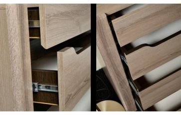 Спальня Афина — мебель для ценителей природы. Гарнитур изготовлен из ЛДСП в древесном декоре Ясень таормина. Естественную красоту дерева подчеркивают вставки в шоколадном декоре Венге на царгах кровати, выполненные из ЛДСП. Угловые вставки на модулях и ножках кровати изготовлены из МДФ с пленкой. Ящики комода и тумбы прикроватной укомплектованы шариковыми направляющими полного и бесшумного выдвижения. Дно верхнего ящика комода выстелено бархатной тканью. Модули входящие в комплект: