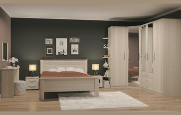 Кровать Диана Д3 160 (1760х2108х1022), Д1 Тумба прикроватная (444х385х425) — 2 шт; Д-5 Шкаф для одежды — 2 шт; Д-7 Шкаф угловой; Д-6 Шкаф для одежды с ящиками; Д-16 Стол туалетный; Д9 Зеркало; Д8 Стеллаж.