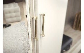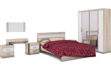 Модульная спальня Ника — новинка фабрики Заречье. Утонченность и изысканность коллекции придает мягкое сочетание цветов и декоративная золотая накладка. Шкафы и тумбы не только экономят пространство, вмещая в себя самые необходимые вещи, но и визуально увеличивают его, превращая даже небольшую квартиру в светлое и просторное помещение. При изготовлении мебели использованы материалы: ЛДСП (16 мм), фурнитура Boyard и Валмакс. Двери снабжены петлями, обеспечивающими плавное закрытие и доведение. Цвет мебели: Дуб Сонома / Белый. Кровать — с мягким высоким изголовьем. Модули входящие в комплект: