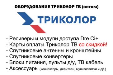 Предлагаю оптом оборудование для приема спутникового оператора Триколор ТВ -ресиверы, модули доступа, карты оплаты, антенны, конвертеры, блоки питания, пульты ДУ, ТВ кабель и др.Официальный дилер.