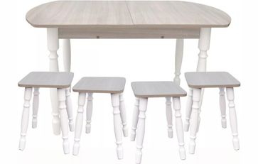 Комплект европейский СМ ДСП ясень станет основой интерьера Вашей кухни или столовой комнаты. В составе набора раздвижной прямоугольный стол со скругленной столешницей и четыре табурета, выполненные в едином стиле и цветовом решении. Мебель производится из качественных материалов - ламинированная ДСП и массив березы. В составе комплекта: Стол Европейский СМ ДСП ясень Табурет ДСП ясень 4 шт. None Есть доставка.