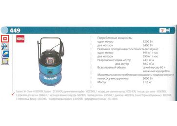 - Пылесос строительный MAKITA 449 (2400Вт, 390мкуб час, 80л, 21кг) по выгодной цене 22 600 р. руб.;