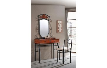 Зеркало, 2 выдвижных ящика, стул с обивкой. Материал: каркас - металл; столешница, выдвижные ящики, элементы декора - дерево гевея и металл. Цвет: дерево - красный дуб, металл - чёрный. Размеры: 95х46х16,2 см Страна-производитель: Малайзия None Страна производства: МАЛАЙЗИЯ Есть доставка.
