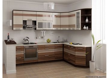 Кухня Рио 16 - 1 3800х1900 Корпус Венге Фасады МДФ Жемчуг глянец (со стеклянной вставкой) / Зебрано глянец Столешница Берилл бежевый Возможно изменение композиции, приобретение по отдельным предметам
