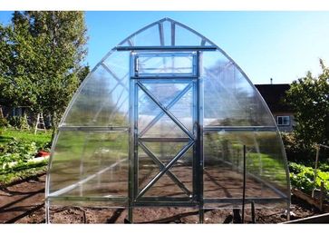 Ширина 2,6 м, высота 2,5 м, длина 4,6,8,10 м Теплица Дачная Стрелка спроектирована для особо снежных в зимний период регионов, и отличается повышенной снеговой нагрузкой и особенностью конструкции каркаса. Детали каркаса теплицы выполнены из оцинкованного профиля толщиной 1 мм. Похожий профиль используется в промышленных теплицах шириной 5 и 7,5 метров с повышенными снеговыми нагрузками. Высота собранного и установленного каркаса теплицы 2,5м, ширина 2,6м. Теплица имеет модульную конструкцию и может иметь различную длину кратную 2 метрам. Нужная длина теплицы обеспечивается установкой дополнительных пакетов с удлиняющими вставками в добавление к базовой длине теплицы 2 метрам. Металлический каркас теплицы изготовлен из оцинкованного железа и собирается с помощью винтов и гаек, весь крепеж идет в комплекте с теплицей. Теплица устанавливается в грунт закапыванием специальных Т-образных окончаний каркаса в землю на глубину 25-30 см. В комплект входит все необходимое для крепления покрытия. Теплица имеет два дверных проема в противоположных торцах. Форточки для проветривания в данной теплице приобретаются дополнительно, по желанию клиента. Для теплицы Дачная Стрелка в полной комплектации с установленными стяжками и боковыми подкосами, предельная снеговая нагрузка достигает 450 кг на 1м2 горизонтальной поверхности земли, что примерно соответствует 2,25 м свежевыпавшего или 1,1 м слежавшегося снега. Мы продаем теплицы из сотового поликарбоната от производителей, ко всем теплицам компании Воля приложена инструкция с голограммой. Дополнительно теплица может быть укомплектована форточкой с автоматическим проветриванием на крыше, перегородкой и системой полива.