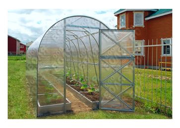 Размеры теплицы: ширина-2м, высота-2,2м., длина-4 метра. Каркас теплицы сборный, изготовлен из оцинкованного металлического профиля, не подверженного коррозии. Крепеж для сборки теплицы и поликарбонат в комплекте. Конструкция каркаса теплицы предусматривает возможности установки без фундамента. В продолжение каждой дуги имеется специальная Т-образная ножка, которая вкапывается в грунт на глубину 25-30 см.