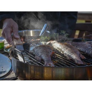 Коптильня из нержавеющей стали круглая 42 см хорошо подходит длягазовой и электрической летней кухни Muurikka.Как на газовой горелке, так и на электрическом гриле создается равномерное и легко регулируемое тепло, что обеспечивает простоту копчения рыбы, мяса.