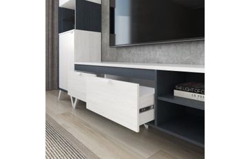 Тумба под телевизор из новой коллекции Винтер выполнена из высококлассного ЛДСП и представлена сочетанием декоров винтенберг и рейн морион. Комбинацию светлого и темного оттенков с текстурой натурального дерева оценят любители стильных и актуальных решений для интерьера. Декор рейн морион в стиле Хай-Тек отличается элегантностью и сдержанностью. Тумба имеет два вместительных выдвижных ящика и открытую нишу с полкой. Тонкие белые ножки несомненно украшают модуль. Особенности:
