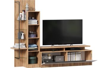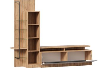 Модуль скомбинирован из шкафа с открытыми и закрытыми полками, тумбы и полки под ТВ. Справа тумба размером 1502х416х465 мм. За откидной дверью на газ. лифтах (угол открывания 85 градусов) ниша, разделенная на две равные части (по 726 мм каждая) вертикальной перегородкой. Дверь открывается с помощью декоративной вставки-ручки. Над тумбой полка под ТВ глубиной 350 мм из ЛДСП 32 мм за счет вертикальной перегородки (ЛДСП 16 мм ) полка опирается на тумбу. Высота ниши между тумбой и полкой 84 мм. Полка под ТВ крепится к шкафу с помощью евровинтов (евровинты в комплекте). Тумба ТВ имеет два варианта установки. Во 2-ом случае в качестве переходного элемента используется стеклополка (349х330 мм). Стеклополка в комплекте. Слева от тумбы ТВ –шкаф (общий размер 590х1800х391 мм) визуально разделенный на две части – непосредственно шкаф (350х1500х391 мм) с 3 полками ЛДСП за распашной дверью (открывается всегда налево) и секцию с открытыми полками (3 стеклополки (223х330 мм) и 1 полка из ЛДСП 32 мм (350х334 мм) – она на уровне полки под ТВ) и декоративным металлическим кронштейном. Расстояние между полками за распашной дверью варьируется от 327 до 351 мм., а в открытой части от 246 до 248 мм. Максимальные нагрузки: на внутреннюю полку ЛДСП - до 15 кг., на открытые полки из стекла и ЛДСП - до 6 кг. Тумба и отделение со шкафом скрепляются между собой с помощью евровинтов. Тумбу ТВ (отделение со шкафом) рекомендуется крепить к стене с помощью угловой подвески. Подвеска в комплекте. Крепеж для подвески к стене приобретается дополнительно. К тумбе ТВ (отделению со шкафом) дополнительно можно заказать подсветку: ЛД 191.040 Блок питания, ЛД 191.050 Напольный выключатель и ЛД 191.070 Клипсу на каждую стеклополку. При необходимости удлинитель ЛД 191.080 в нужном количестве. Опоры модулей гостиной не регулируются по высоте. Сборка модулей и навеска фасадов осуществляется только, так как показано на изображении. Сборка модулей на другую сторону не предусматривае