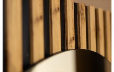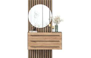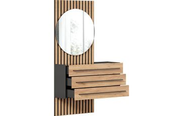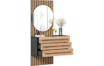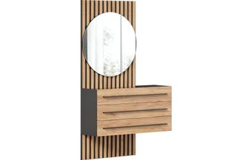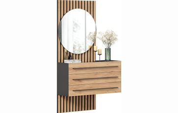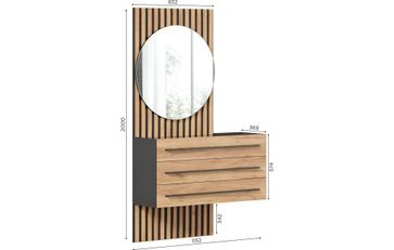 • Вверху круглое зеркало, закрепленное на вертикальной стенке. • Внизу тумба с 3-мя выдвижными ящиками на направляющих нижнего крепления полного выдвижения. • Размер фасада ящика 1150х190 мм, глубина ящика 300 мм. На верхнем горизонте тумбы закреплено стекло черное 4 мм • Максимальная нагрузка на ящик - 15 кг. • Тумба крепится к стене с помощью угловой подвески. Подвеска в комплекте. • Крепление для подвески к стене приобретается дополнительно. None
