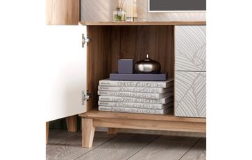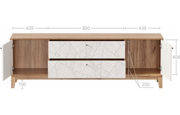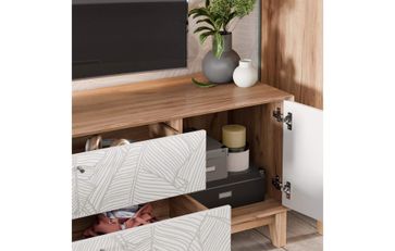 • На опорной нижней горизонтальной стенке крепятся опоры ППУ. • В центре два выдвижных ящика на шариковых направляющих нижнего крепления не полного выдвижения с доводчиком.. • Размер фасада ящика 890х201 мм. • Максимальная нагрузка на ящик – 15 кг. • Слева и справа за распашными дверями ниши. • Петля с доводчиком, угол открывания 1100. • Тумбу ТВ рекомендуется прикрепить к стене с помощью угловой подвески, подвеска в комплекте. • Крепеж к стене приобретается дополнительно. None