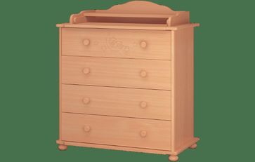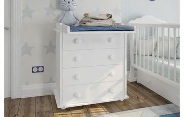 Комод Амалия MLK — модель для комнаты новорожденного. Комод оборудован 4 выдвижными ящиками и пеленальной доской.