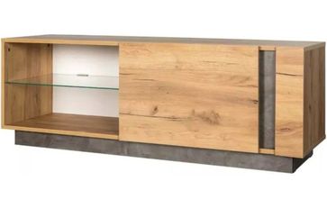 Тумба под ТВ с элементами геометрического конструктивизма, что позволяет поставить её в гостиную выполненную от стиля лофт до урабанизма. Данная модель очень выигрышно смотрится и выделяется среди моделей подобного стиля, и всё благодаря тому, что тумба выполнена под натуральный цвет и фактурой свежеспиленного дерева в сочетании серого цвета серого камня, со стеклянными ставками. Поставив тумбу в свою гостиную вы сможете освежить интерьер и впустить новую струю в дизайн вашей квартиры. А добавив шкафы и полку серии Арчи, вы соберете полноценную оригинальную стенку для гостиной.