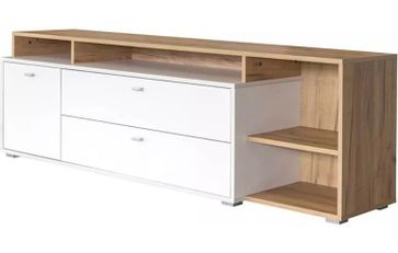 Большая тумба под подойдет для для широкоэкранного ТВ. Выдержанна в традициях стиля минимализм, сочетание модного белого цвета с теплым древесным оттенком Дуб золотой. Оригинальная конструкция представляет собой группу открытых ниш и короб с двумя выдвижными ящиками.