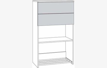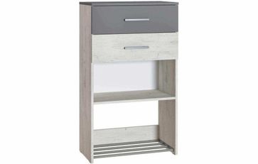 Модель имеет две открытые полки для обуви и два выдвижных ящика для мелочей.
