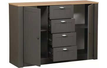 Модель оборудована широкой столешницей, слева и справа секции с полками и дверцами, по центру 4 выдвижных ящика. None Страна производства: Россия Есть доставка.